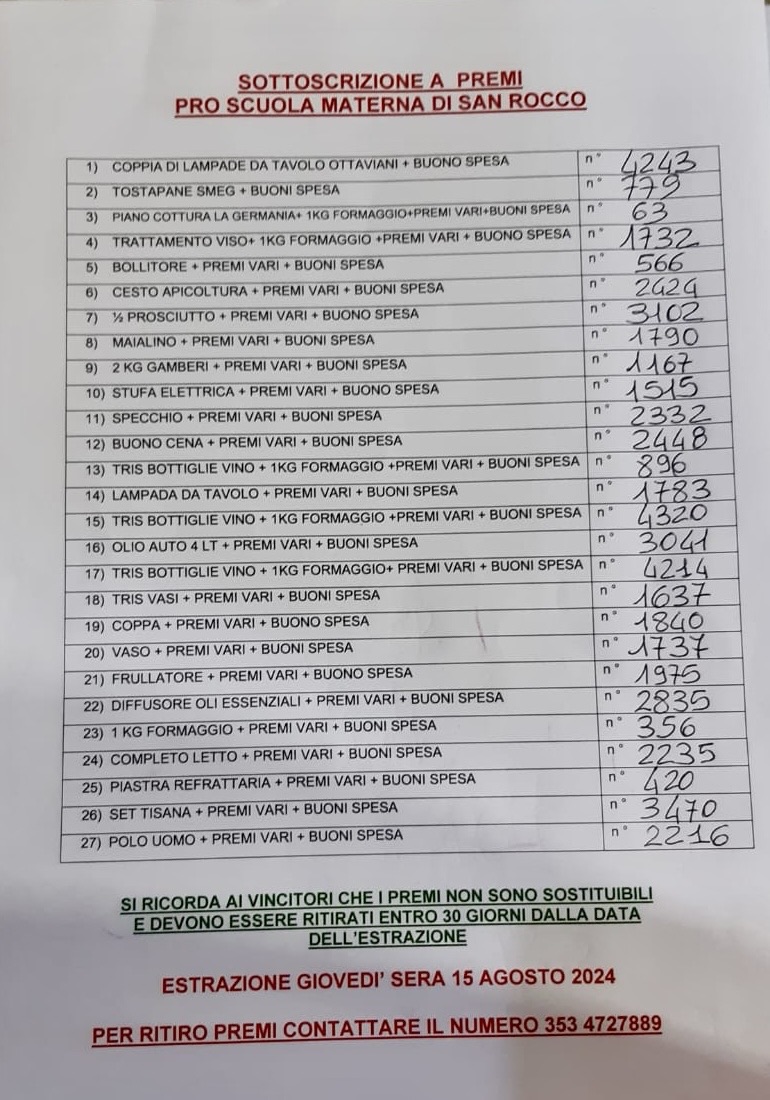 Biglietti estratti Sottoscrizione a premi pro Scuola San Rocco