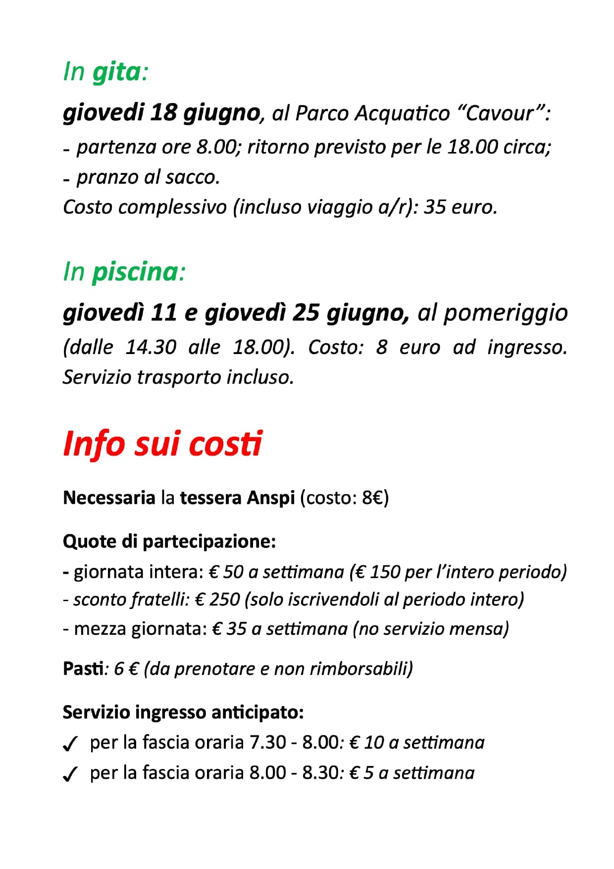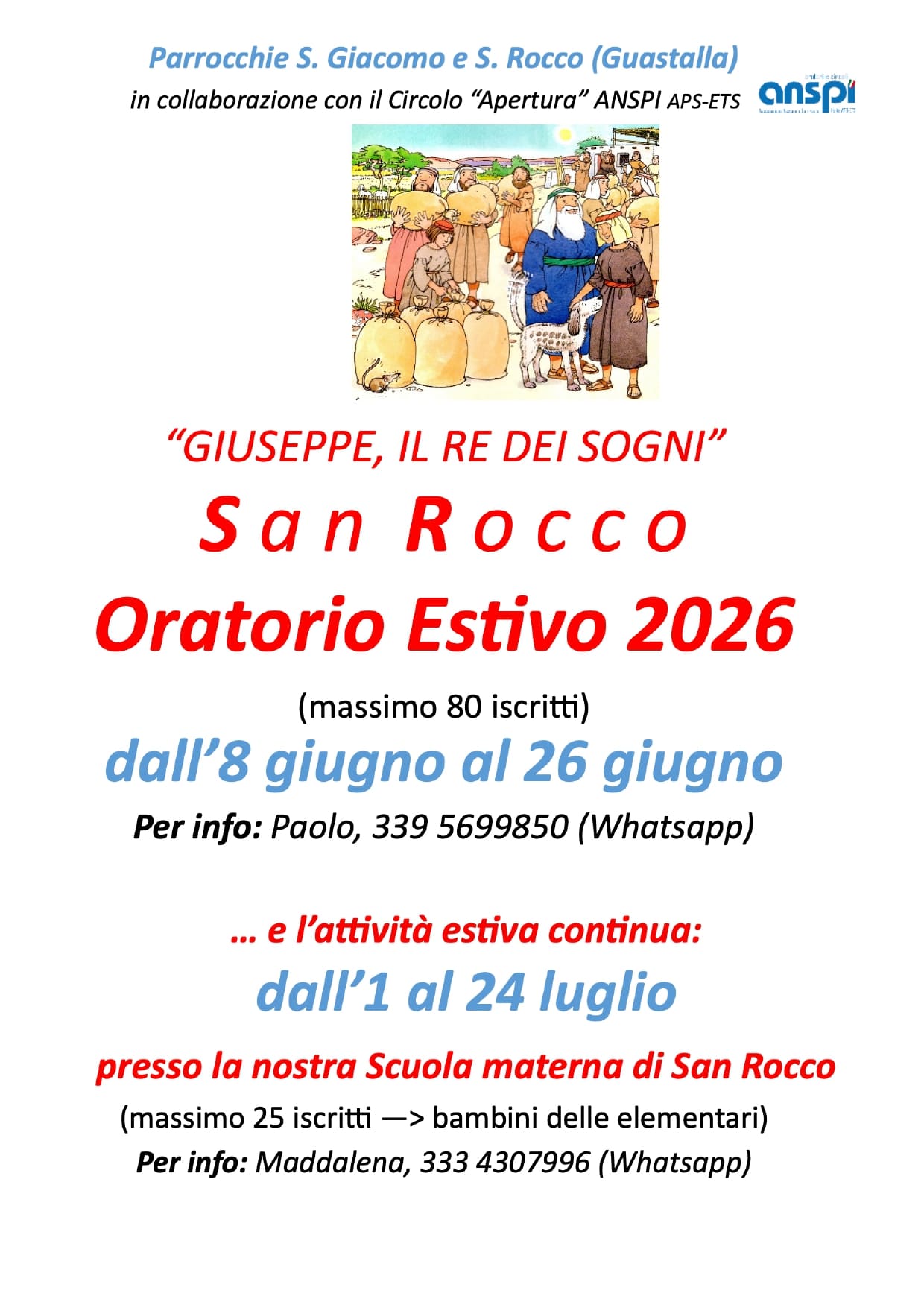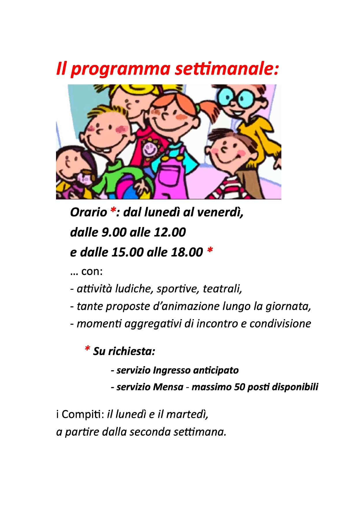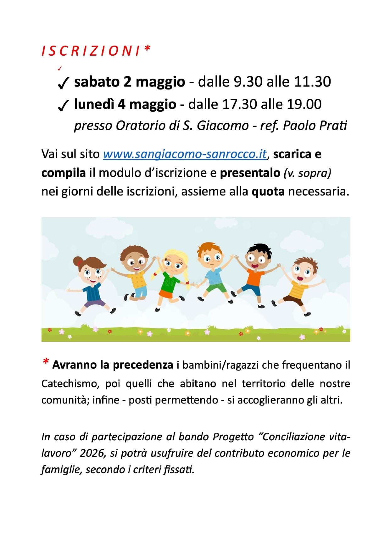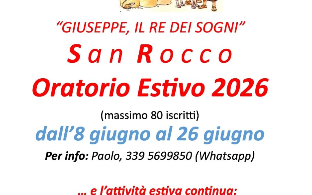 Anche quest’anno, dal 8 al 26 giugno, negli spazi della Parrocchia di San Rocco, aspettiamo bambini e ragazzi per vivere un’esperienza indimenticabile e travolgente! Tutte le informazioni di seguito, con le date e le modalità per l’iscrizione. E l’attività prosegue anche dal 1 al 24 Luglio presso i locali della Scuola Materna di San Rocco (riservato ai bambini delle elementari).
